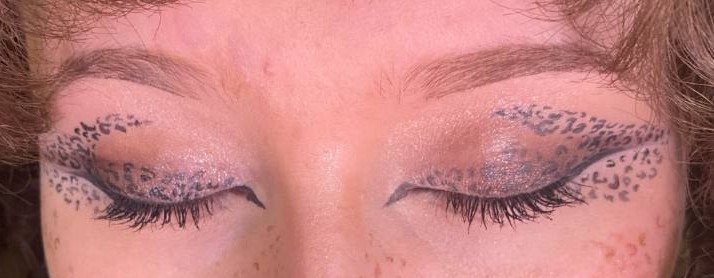 I completed this look with a full coverage concealer base, shimmery brown eyeshadow applied with an angled precision brush and liquid eyeliner for the print and eyeliner. The leopard print freckle pattern was stamped from my fingertip with a liquid freckle pen.